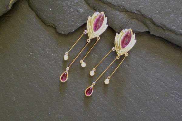 No one knows what jewelry looks best on woman's body better than a woman designer. That's the beauty of Catharine M Designs, a seasoned goldsmith with a woman's touch. Fine gold jewelry designed and crafted by Catharine M looks and feels uncommonly feminine, evoking a response of admiration from those who glimpse the platinum and gold masterpieces. Color, texture and movement are the muse of Catharine M, as she forms alloys of yellow, white, rose and green gold to compliment any color of stone. Many of these pieces have been custom designed and manufactured for clients throughout the United States, while others are available for sale. Most any of these designs can be recreated to make a uniquely tailored piece using the colored stones or diamonds of a client's choosing to make a piece all their own, or have your family heirloom stones incorporated into one of these fabulous designs!