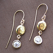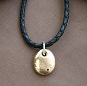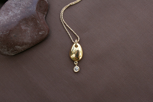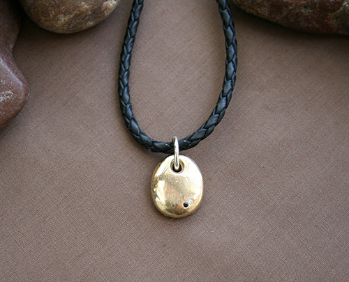 In this locally inspired offering, Catharine M displays her creative versatility with the incomparable River Stone Collection. These exquisite stones are hand collected along Northern California coastline beaches and Sonoma County river beds by Catharine and her two beautiful daughters. The hole drilled in each of these stones is lined with sterling silver, 14, or 18 karat gold! A neck chain of sterling, gold, leather or ribbon harnesses the art. Also offered is a richer version of nature's water polished jewels, captured by Catharine M. in the simple buttery smoothness of river stones rendered in pure gold, with or without accent diamonds or other gemstones. This simple elegance alone, or juxtaposed and in tandem with these naturally polished river stones of extraordinary color, texture and richness allow the wearer to honor and celebrate the unmanufactured beauty of nature, by imbuing it with hand worked gold.